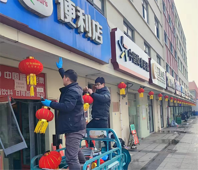 物業(yè)管理部工作人員扛上梯子,拿著燈籠,為沿街商鋪門(mén)前掛上了一個(gè)個(gè)大紅燈籠,將我們商業(yè)區(qū)裝點(diǎn)的漂漂亮亮。過(guò)年掛燈籠是中國(guó)傳統(tǒng)習(xí)俗,紅色代表喜慶,圓形燈籠則寓意團(tuán)圓美滿(mǎn),紅燈籠象征著平安祥和和紅紅火火。建發(fā)公司希望商鋪們?nèi)兆舆^(guò)的紅紅火火,過(guò)一個(gè)平安祥和幸福年。