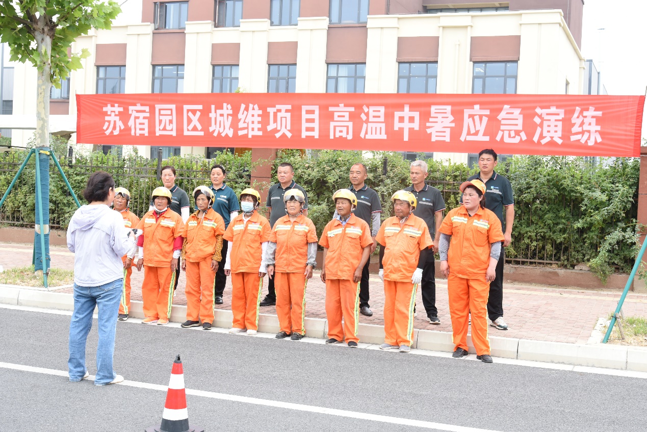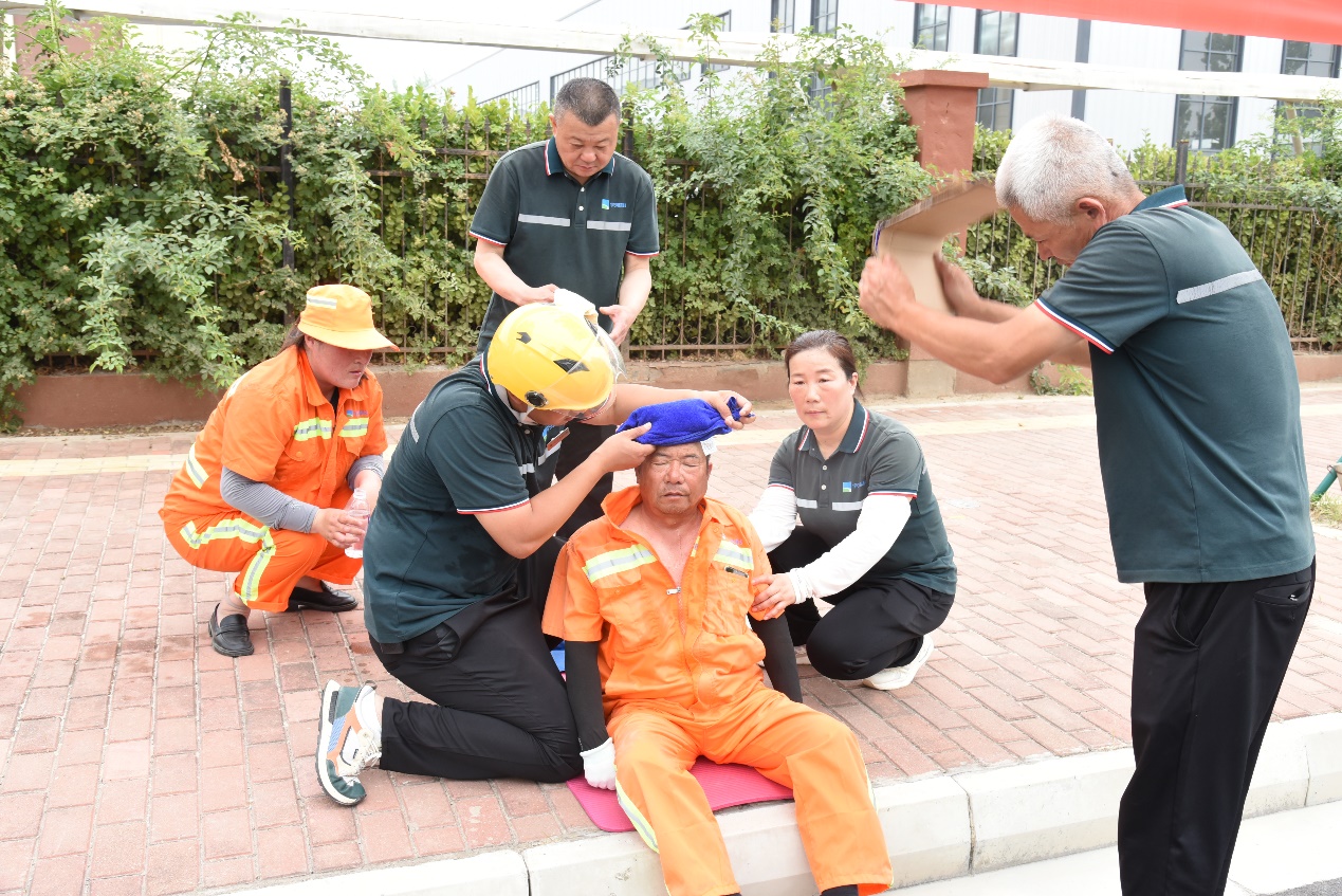 此次演練模擬鏡泊湖路一名環(huán)衛(wèi)工人在作業(yè)過程中,突然感到頭暈、心慌乏力,立即向主管人員電話求助。主管人員隨即趕到現(xiàn)場查看情況,發(fā)現(xiàn)環(huán)衛(wèi)工人躺坐在現(xiàn)場,面色潮紅、大汗淋漓,精神狀況不佳,系中暑跡象,立即向項目經(jīng)理報告,聯(lián)系應(yīng)急救援人員,并呼喊附近作業(yè)人員將其攙扶到陰涼處,解開衣扣散熱,應(yīng)急救援人員趕到現(xiàn)場后,立即用濕毛巾、酒精棉擦拭身體,涂上清涼油,喂服藿香正氣水、淡鹽水......,經(jīng)過初步救護,中暑人員癥狀得以緩解后,隨即將其送往園區(qū)社區(qū)衛(wèi)生服務(wù)中心進一步治療。