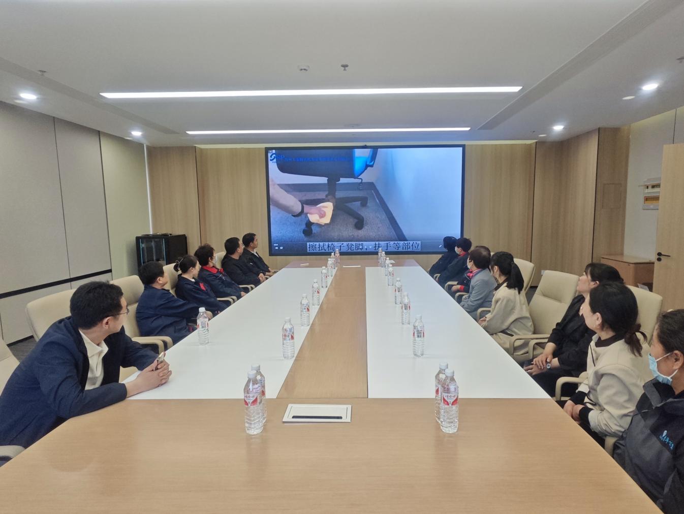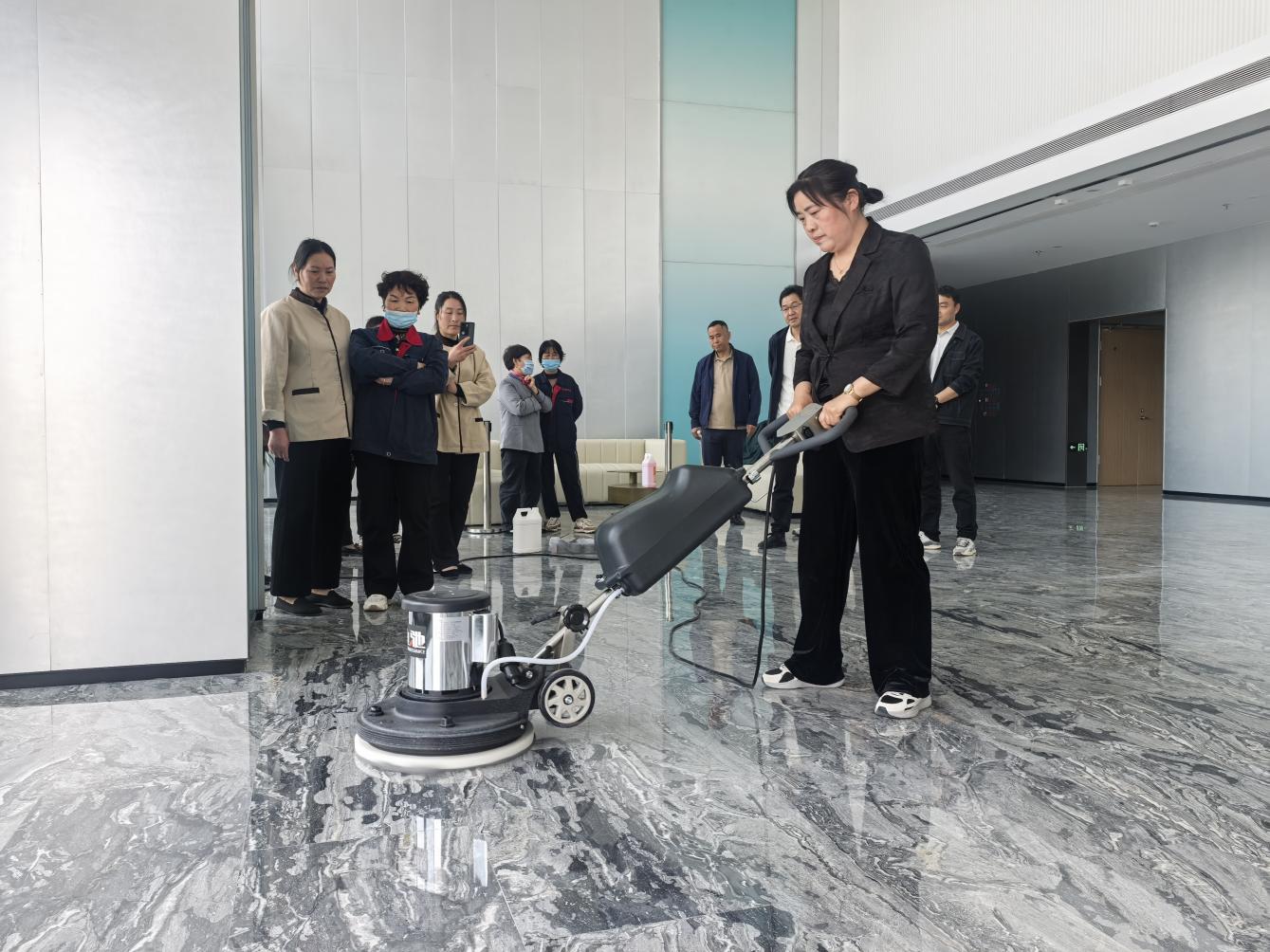 培訓圍繞辦公大樓地面清掃、電梯轎廂清潔保養(yǎng)、玻璃幕墻清洗維護、會議室、茶水間及衛(wèi)生間細節(jié)處理到外圍路面和綠化區(qū)域的日常清理管養(yǎng)等內容,通過觀看視頻和現(xiàn)場演示方式,詳細講解了操作規(guī)范和作業(yè)標準,確保保潔人員能夠熟練掌握高效、科學的清潔技巧,提高工作質量與效率。