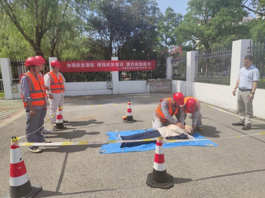 在園區(qū)為民河南閘站和利民河北閘站,分別模擬配電房火災、維護人員觸電兩類典型事故場景開展應急演練。針對電氣火災事故,參演人員嚴格遵循應急處置流程,依次完成切斷電源、報警聯(lián)絡、組織撤離、滅火器實操滅火等動作;針對觸電事故,則有序執(zhí)行斷電急救、撥打 120、心肺復蘇現(xiàn)場搶救等規(guī)范操作。兩類演練均以 “模擬事故 — 響應處置 — 流程實操” 為脈絡,使維護人員系統(tǒng)掌握不同事故的處理流程與協(xié)作要點,切實提升應急處置的規(guī)范性與團隊配合效率。