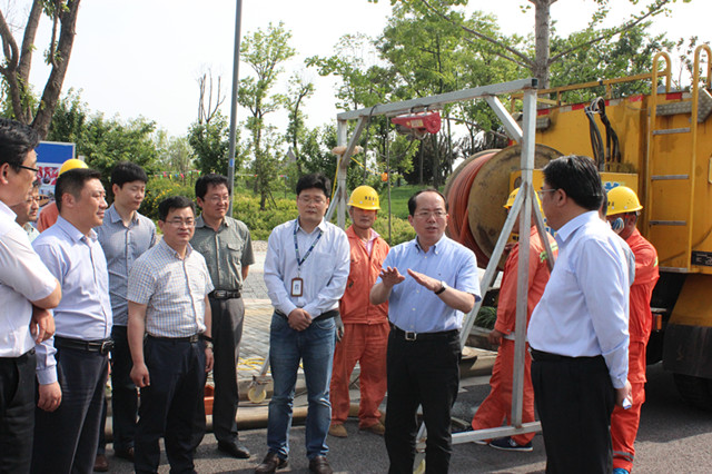 在同里湖路,李榮錦認(rèn)真聽取了園區(qū)城市排水防澇工作進(jìn)展情況匯報(bào),現(xiàn)場(chǎng)查看了管道疏通清淤工作,并詳細(xì)詢問了管道CCTV檢測(cè)流程等情況。